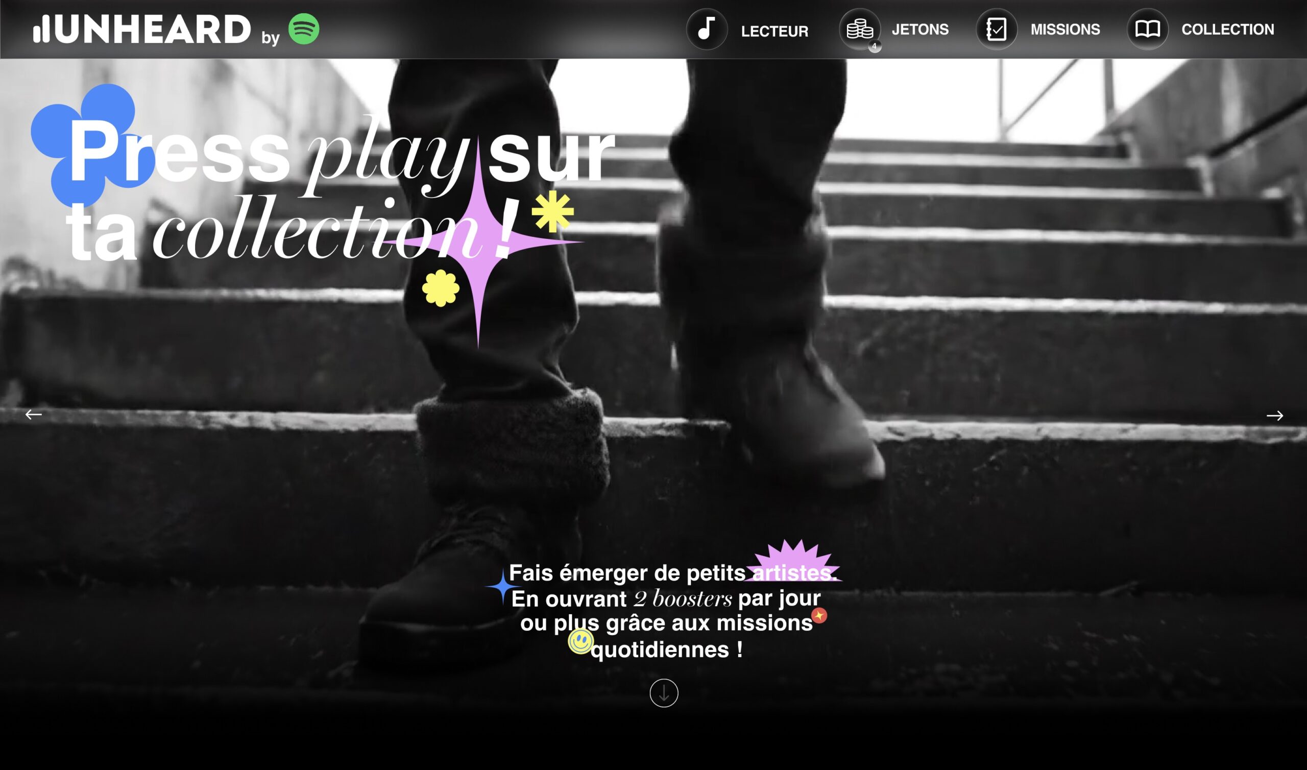 Unheard est une extension Spotify qui a pour objectif de mettre en avant de petits artistes grâce à l’ouverture de boosters contenant des cartes d’artistes uniques.